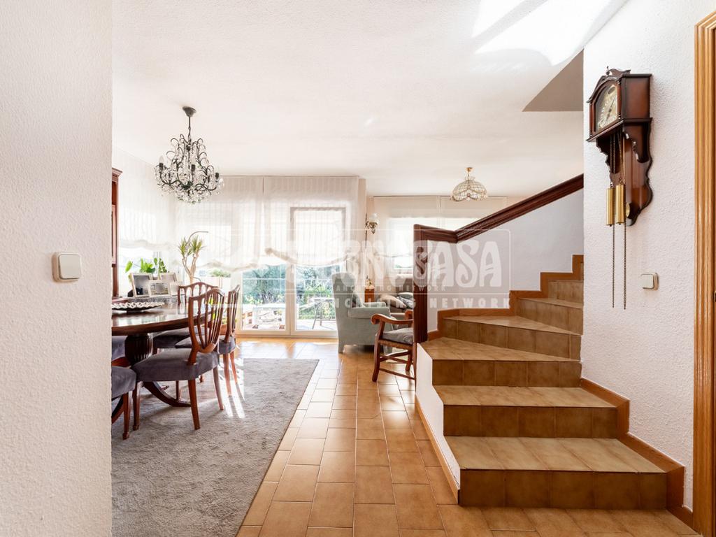 En la planta principal, un elegante recibidor nos da la bienvenida y nos conduce a un amplio y luminoso salón-comedor con acceso directo a una encantadora terraza con vistas al jardín. En esta misma planta encontramos un aseo de cortesía, una cocina independiente con salida a una fantástica zona de barbacoa —perfecta para reuniones familiares o con amigos— y un garaje integrado, que facilita el acceso directo a la vivienda y evita cargar la compra por las escaleras.