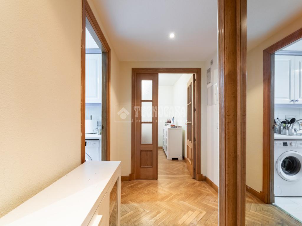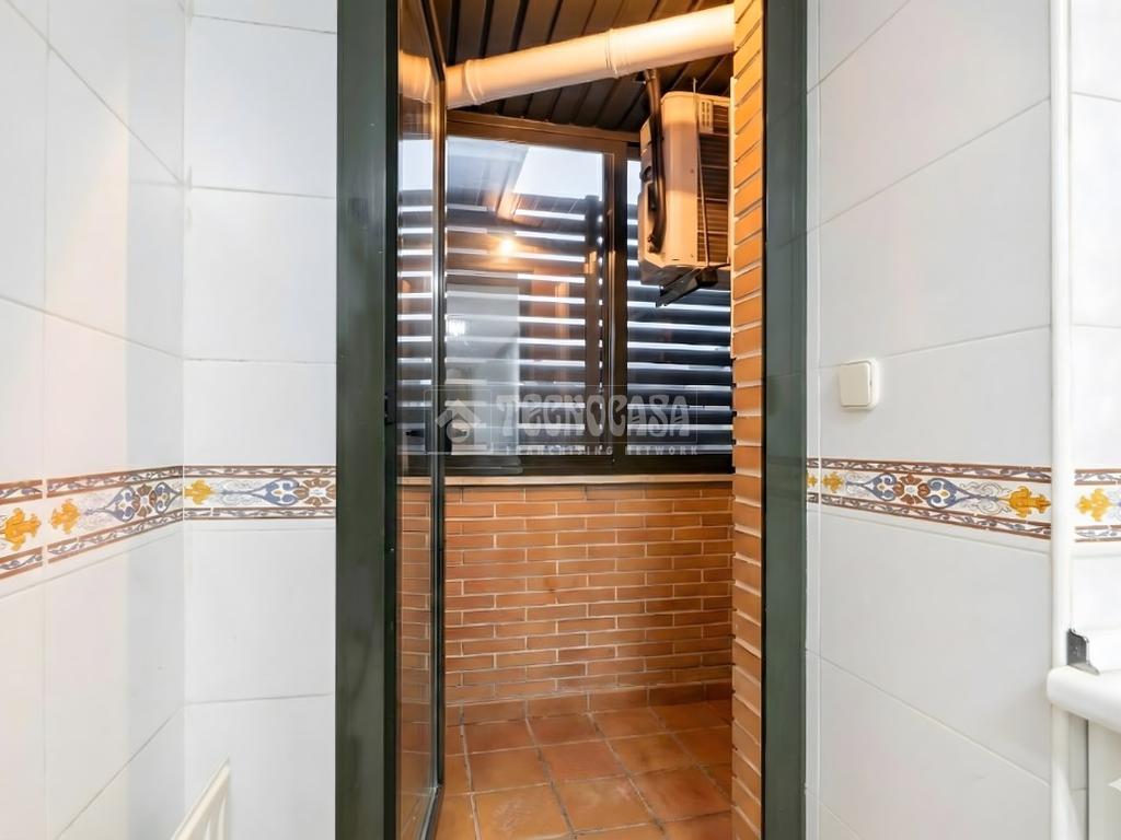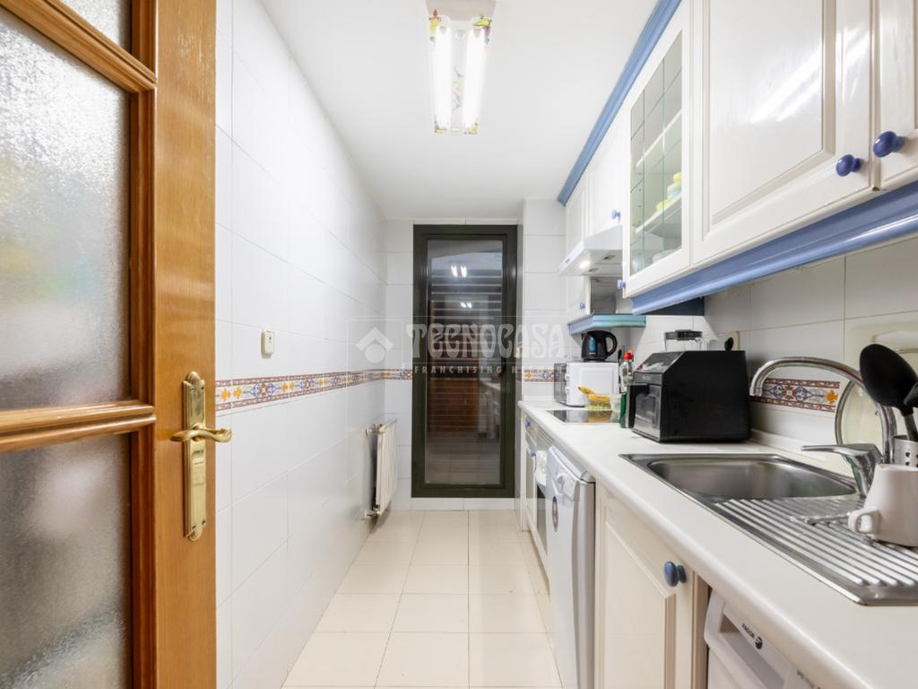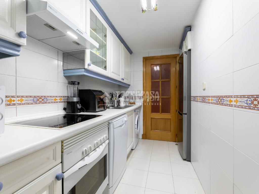 La vivienda se distribuye en un recibidor/distribuidor que da paso a un amplio y luminoso salón comedor ampliado tras una obra que le dio la terraza. Un cocina en pasillo distribuida a una encimera, con mucho espacio de almaceanamiento y paso directo a una terraza tendedero que alberga además la caldera de gas natural del inmueble.