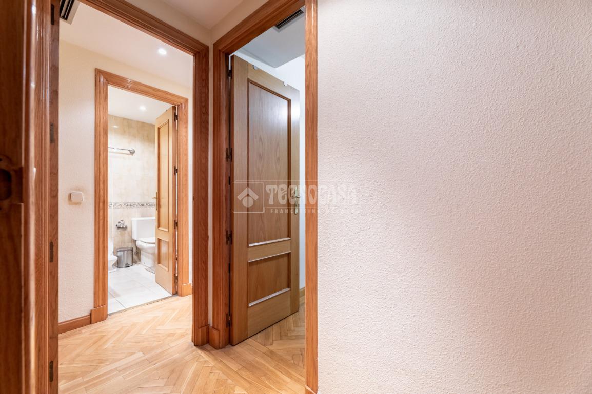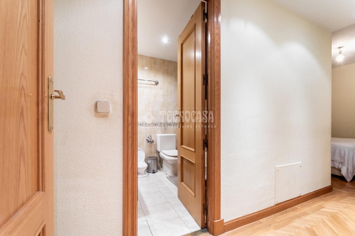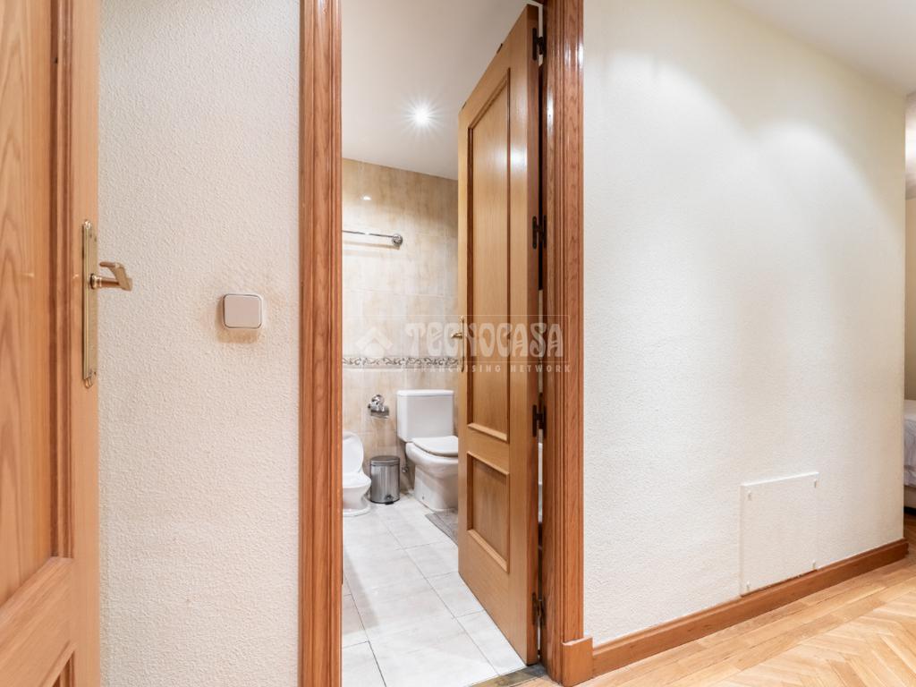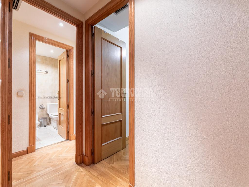 Seguidamente damos paso mediante un pasillo distribuidor, con armario empotrado con espejo, a la zona privada del piso: con un primer dormitorio con armario empotrado de puertas correderas con espejo y el dormitorio principal, también con armario empotrado de puertas corredera, y un cuarto de baño en suite con bañera. Finalmente, la casa tiene un segundo cuarto de baño completo, con bañera también.