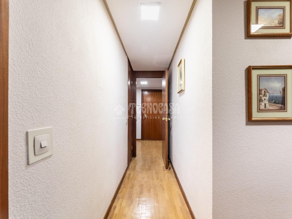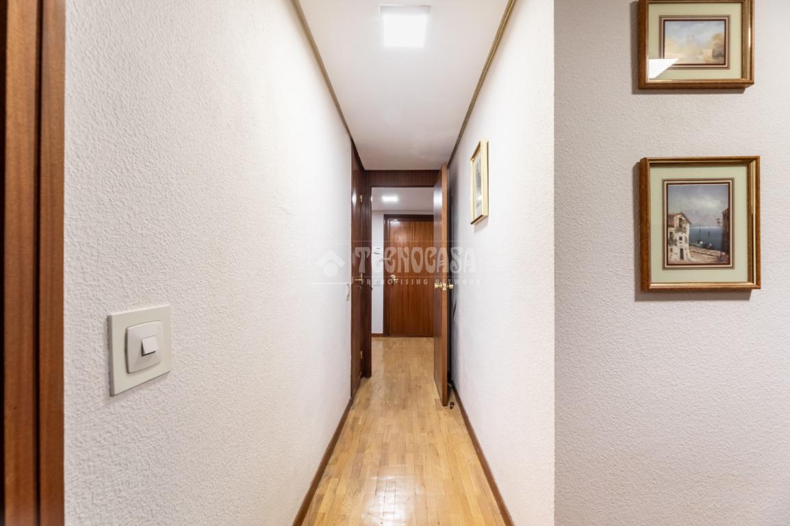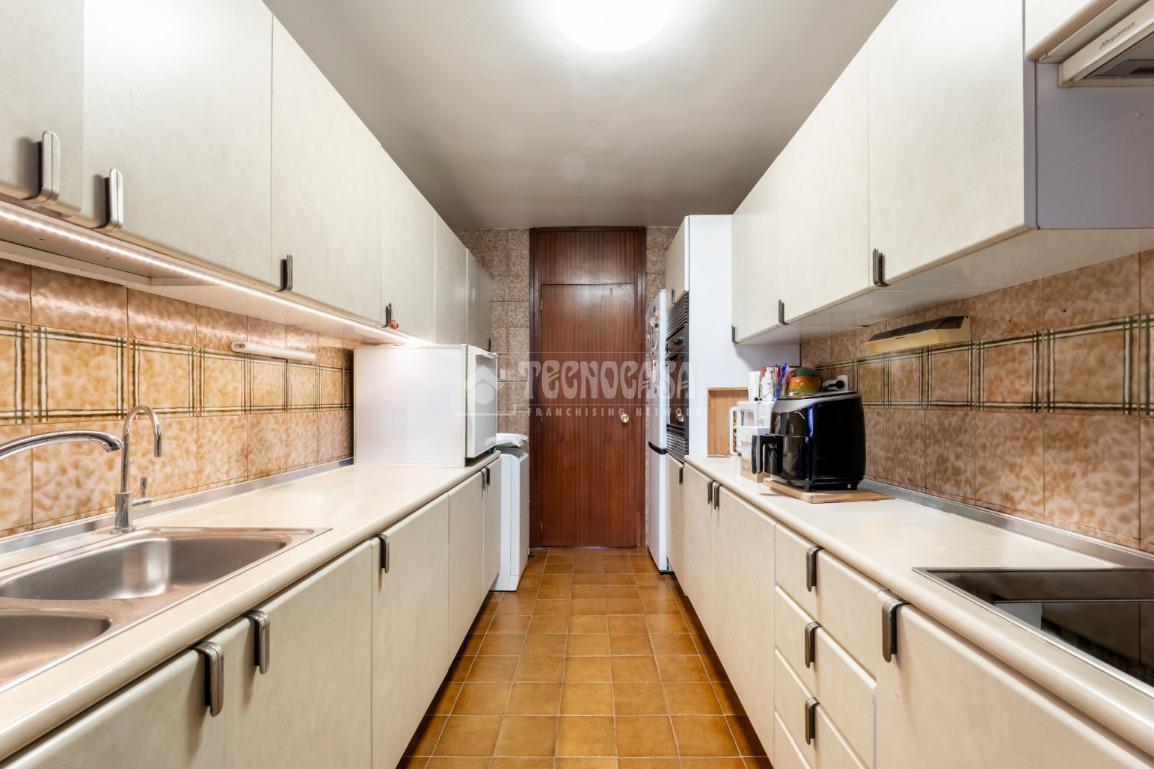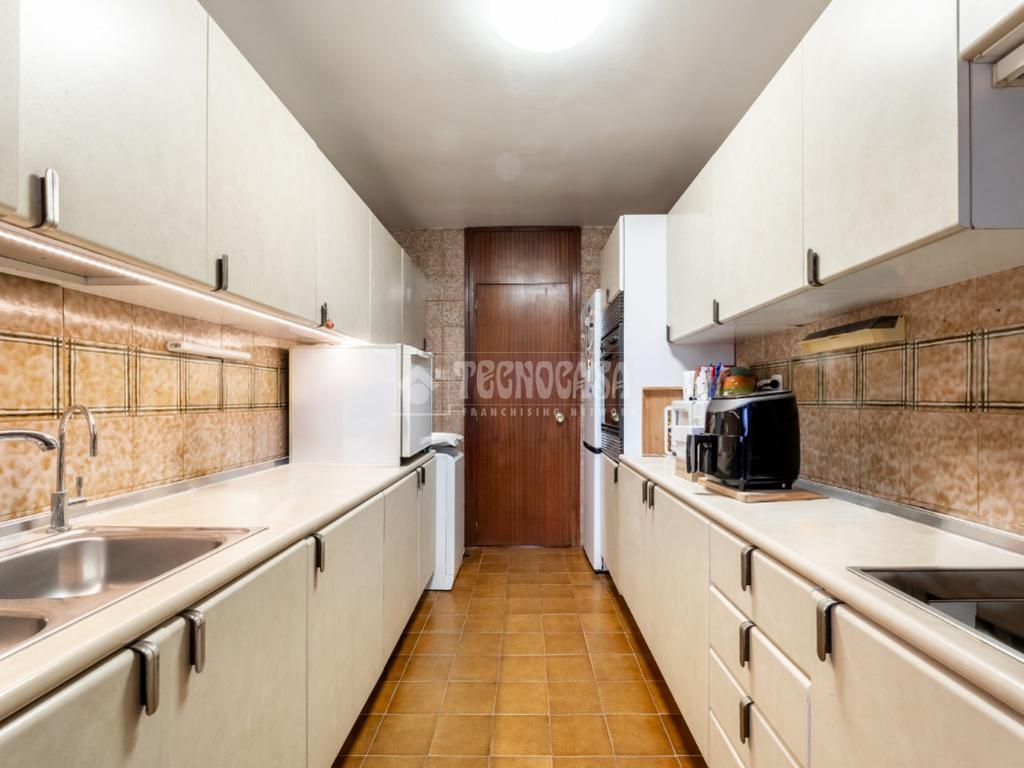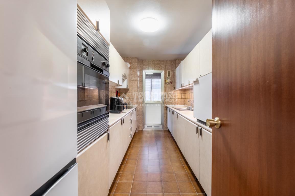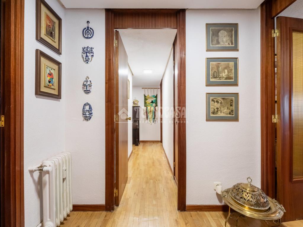 Al piso se accede por un distribuidor muy amplio que nos da acceso directo a un gran salón-comedor con su terraza propia, que se actualizó con cerramiento con ventanas y toldo, zona de sala de estar (con chimenea perfectamente funcional) y comedor. Al otro lado del distribuidor nos encontramos una cocina de fabulosas dimensiones distribuida con doble encimera y que termina en una terraza-tendedero.