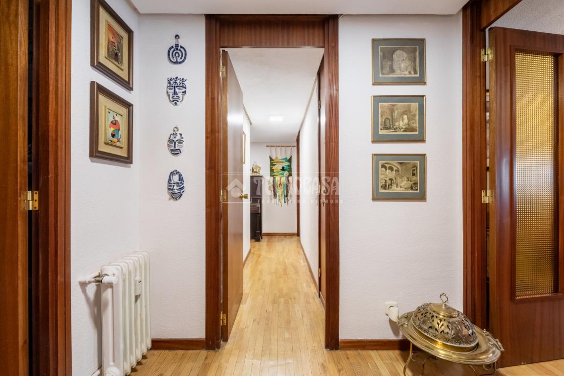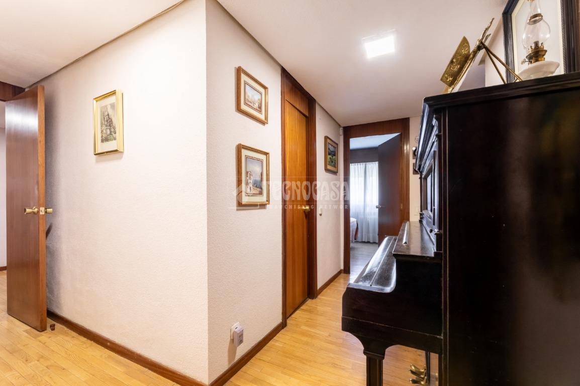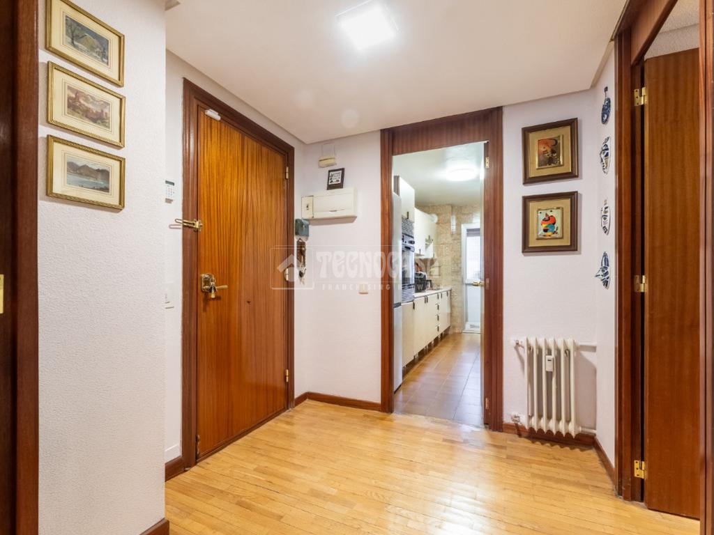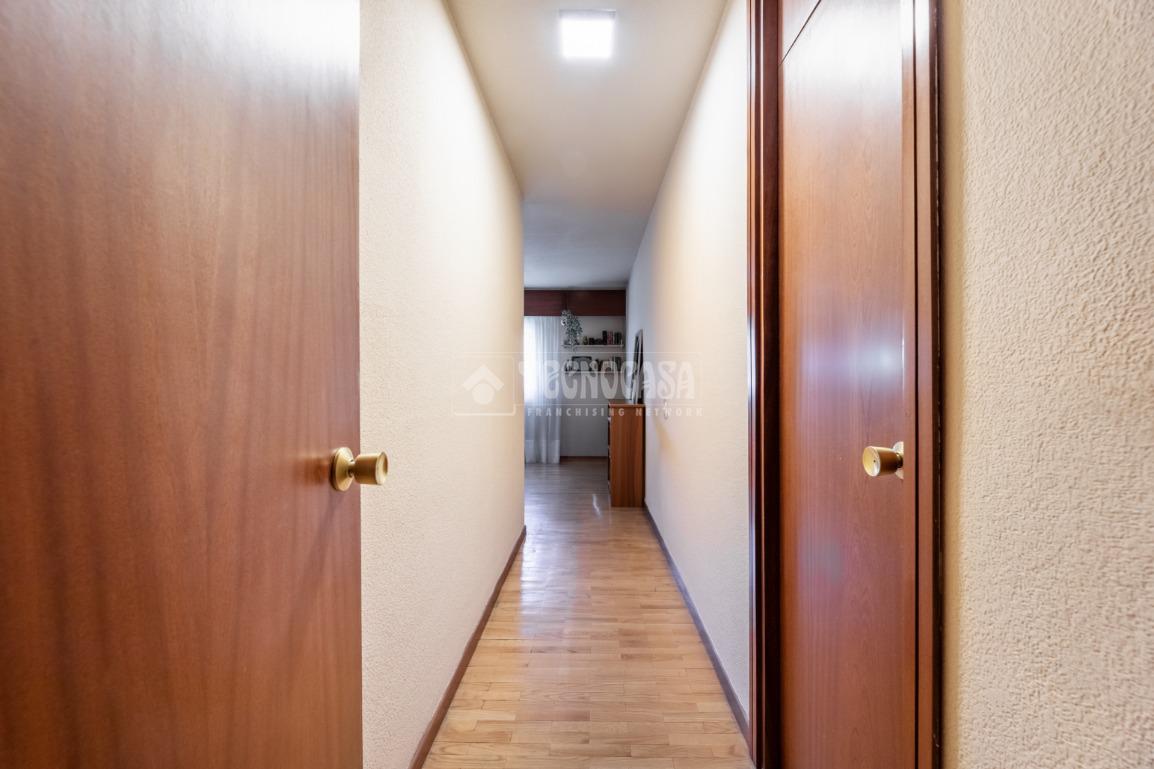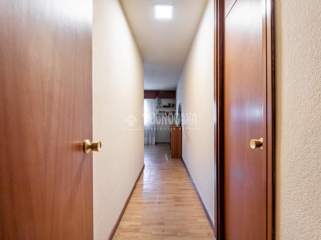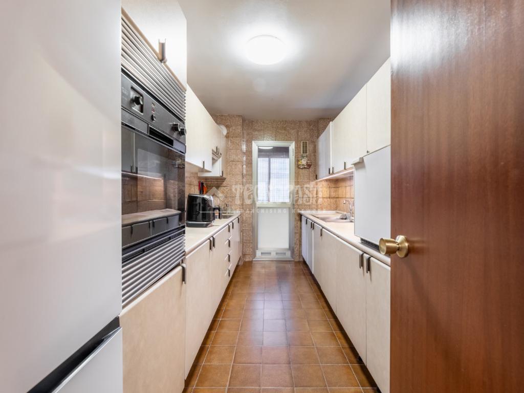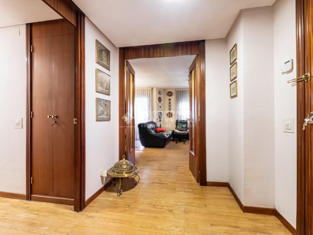 Al piso se accede por un distribuidor muy amplio que nos da acceso directo a un gran salón-comedor con su terraza propia, que se actualizó con cerramiento con ventanas y toldo, zona de sala de estar (con chimenea perfectamente funcional) y comedor. Al otro lado del distribuidor nos encontramos una cocina de fabulosas dimensiones distribuida con doble encimera y que termina en una terraza-tendedero.